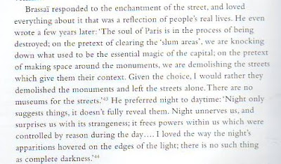 Holy Cow! The text is slanted! I'm leaking consonants! Anyway, the quote above is the reason I put up this piece about Brassai. Before reading it, it never occurred to me that a part of town that's particularly appealing or mysterious should be left standing even if the architecture is just so-so. A street or a square or a neighborhood that attracts people, that exerts an indefinable magnetism or charisma over generations, should be preserved even if no one can figure out what the attraction consists of.