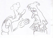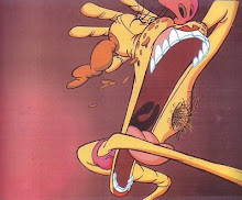 The way that John K extemporizes on the voices that inspire him -Lorre, Douglas, Ives, Fine et al.- has inspired me to think about character development though vocal experimentation. I'm interested in creating a girl character and starting out by gradually coaxing a new personality out of an impersonation, much like John did with both his own voice and by describing his "childish Larry Fine" idea to Billy West. Obviously I can't use my own voice if I want her to sound anything like a woman, so I will be relying on a female voice artist. But my aim is to start with Bette Davis and maybe a bit of Rosalind Russell and then work outwards and inwards from there. Of course, I'm sure I'll come off as a total autocrat and drive everyone insane, but hey, John wasn't afraid of doing that, so why should I be?