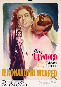 A TITLE sweeps up from the floor: "It's JOAN Crawford....(new title, building music)...in her most DARINGLY DIFFERENT portrayal...(big, new title and furiously building music)...'MILDRED PIERCE'."